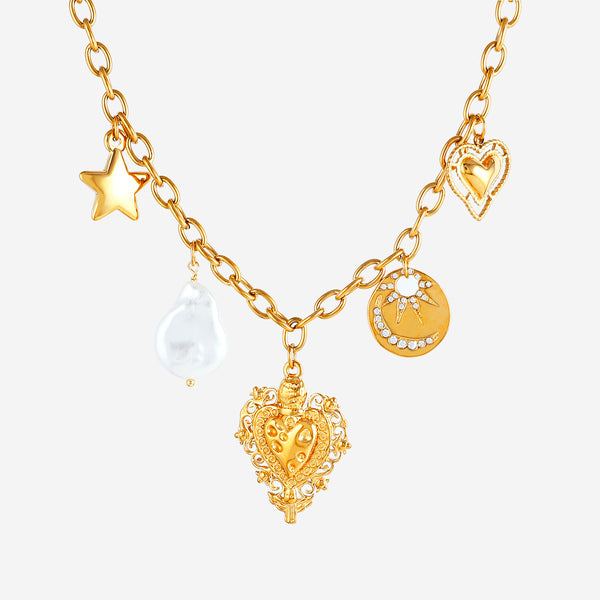 Ce collier long en acier inoxydable se compose de plusieurs pendentifs délicatement disposés le long de la chaîne, créant un effet raffiné et moderne. Avec une longueur d’environ 400 mm,...
