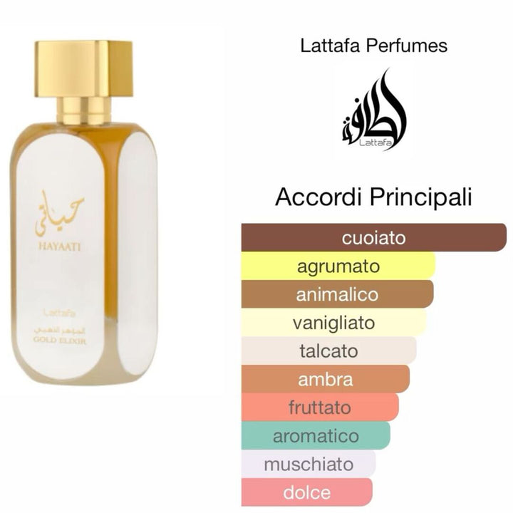 Découvrez la qualité supérieure d'un parfum créé dans l'étonnante métropole des Émirats arabes unis. Logée dans un flacon luxueux doté d'un élégant bouchon en or, l'Eau de Parfum mixte Lattafa Hayaati Gold Elixir vous procure un sentiment durable d'exclusivité.