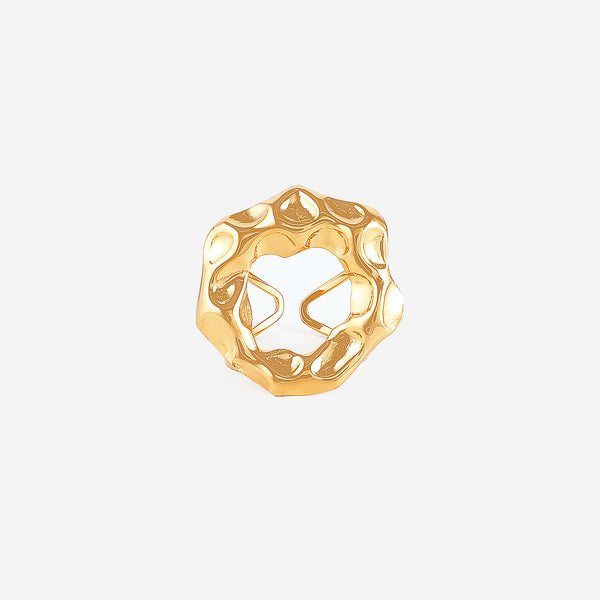 Cette bague au design ouvert et large se distingue par sa surface travaillée selon une technique martelée, créant un relief unique et une texture irrégulière qui évoque une beauté naturelle...