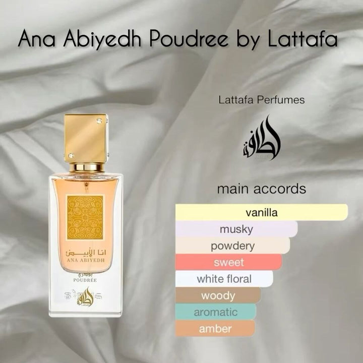 L'eau de parfum pour femmes Lattafa Ana Abiyedh Poudrée risque fort d'éveiller en vous une nouvelle dépendance dont vous ne pourrez plus vous passer. Elle vous charme dès les premières senteurs et continue de vous prouver, jour après jour, qu'elle mérite réellement une place d'honneur sur votre coiffeuse.