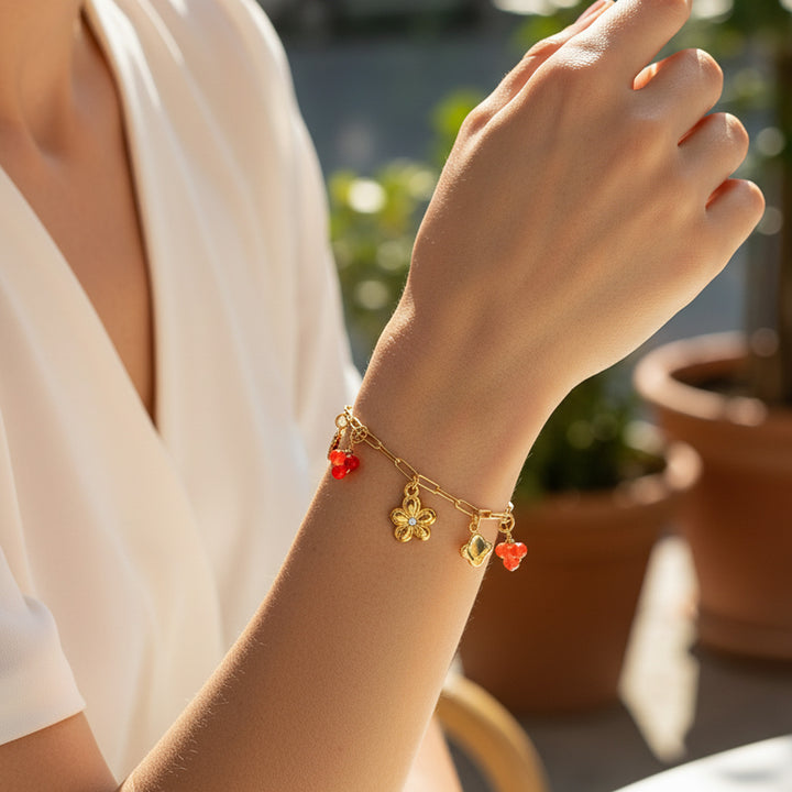 - Élégant bracelet breloque avec des motifs de fleur et de soleil.