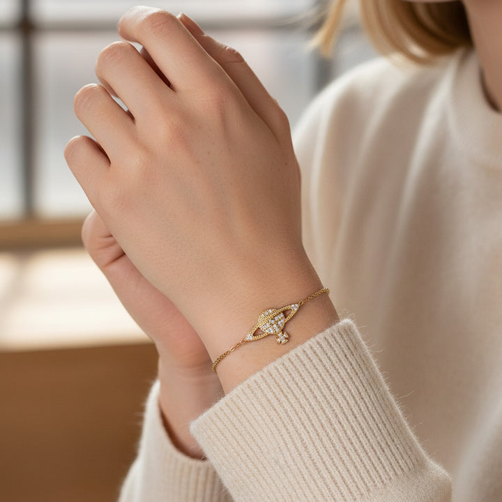 Ce bracelet en acier inoxydable met en valeur un pendentif en forme de planète, orné de strass scintillants qui ajoutent une touche d’éclat. La chaîne fine et élégante s’harmonise parfaitement avec ce design original, offrant un bijou à la fois raffiné et tendance. Polyvalent, il peut être porté au quotidien pour apporter une touche chic à votre style, ou lors d’occasions spéciales comme un dîner, une fête ou un rendez-vous romantique.Confectionné en acier inoxydable de haute qualité, ce bracelet est durable, confortable et élégant, conservant son éclat même après un port prolongé. Sa longueur totale est d’environ 160 mm, alliant esthétique et praticité.