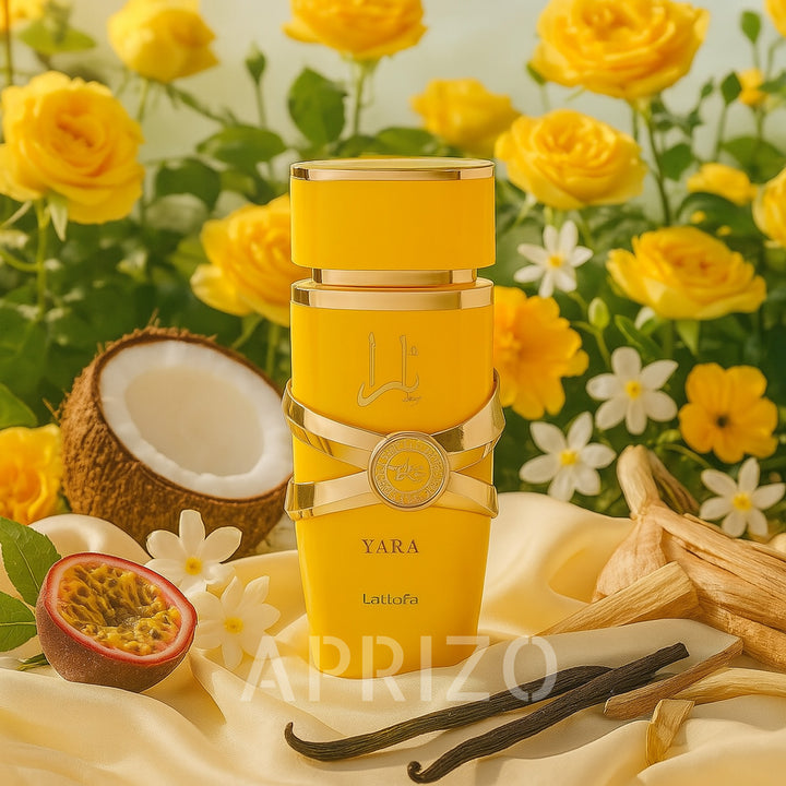 - Yara Tous de Lattafa Perfumes est une fragrance féminine, exotique et lumineuse, où des accords fruités, floraux et boisés se mêlent pour offrir une expérience olfactive joyeuse et élégante.